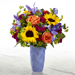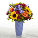 The FTD® Touch of Spring® Bouquet brings fresh beauty and color to your special recipient's door in honor of spring's long awaited arrival! Bold sunflowers and orange roses take center stage of this fresh flower arrangement surrounded by the complementary colors of blue iris, violet mini carnations, and lush greens. Presented in a stylish ceramic blue vase embossed with a modern circular patter throughout, this gorgeous spring bouquet is ready to celebrate a birthday, graduation, or send your warmest thank wishes to you special recipient. Premium packaging included. GOOD bouquet is approx. 16"H x 12"W. BETTER bouquet is approx. 16"H x 13"W. BEST bouquet is approx.. 17"H x 15"W.