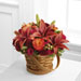The FTD® Abundant Harvest™ Basket is bejeweled in Autumn's most majestic hues creating an arrangement of blooming beauty. Dark orange Asiatic Lilies, bi-colored orange roses, burgundy miniature carnations, fuchsia spray roses, peach hypericum berries and millet grass are bountifully displayed in a natural wood basket to celebrate the inspiring beauty of this coming harvest season.