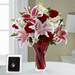 A1JThe FTD® Anniversary Bouquet with Heart Pendant speaks to the romance and long lasting love of this momentous and special occasion. Gorgeous red roses, fragrant stock stems, pink Oriental lilies, eye-catching Starfighter lilies and lush greens are brought together to create an elegant and simply beautiful flower arrangement. Presented in a stylish red glass vase with a modern twist design, accompanied by a stunning sterling silver heart-shaped pendant with a genuine white topaz accent, this sophisticated flower bouquet will make that perfect impression on your loved one in honor of the years of cherished commitment you have made to one another or to help the special couple celebrate their big day. Pendant measures 5/8" including bale. 18-inch sterling silver box chain with spring ring closure. Includes a single 1/2-ct round cut genuine white topaz. Imported.