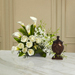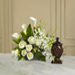 This extraordinary mixed flower bouquet is an excellent choice for creating a beautiful, serene and reverential setting for an urn containing the cremated remains of the deceased. The asymmetrical arrangement is hand-arranged by a local FTD artisan florist and includes Dendrobium orchids, roses, calla lilies, and lush, complementary greenery in a low silvery plastic rectangular container. Beautiful on its own or to enhance a display of a meaningful memento, photograph or candle.