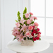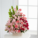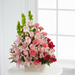 The FTD® Beautiful Spirit™ Arrangement is a light and lovely way to honor the life of the deceased. A blushing display of pink roses, Asiatic lilies and Peruvian lilies are highlighted by stems of fuchsia carnations and spray roses as well as Bells of Ireland and assorted lush greens. Seated in a white woodchip basket, this graceful arrangement creates an exceptional way to offer peace and sympathy.