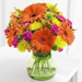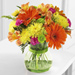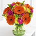 Pick a day - any day - to tell someone how special they are to you. Send them this exuberant, brightly colored bouquet of orange Gerbera daisies, yellow poms, hot pink mini carnations and vivid green button poms in a sleek, beaded green glass vase. Guaranteed to bring a smile!
