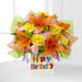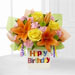 The FTD® Birthday Celebration™ Bouquet brings together roses and Asiatic Lilies to create a bright and cheerful way to send your happy birthday wishes! Yellow roses, orange Asiatic Lilies, pink mini carnations, green button poms and lush greens are brought together to create a vibrant, sunny flower arrangement. Presented in a ceramic designer vase with "Happy Birthday" displayed on the front in colorful lettering, this flower bouquet is beautifully accented with curling ribbon and designer floral wrap sheets to make this a birthday they won't soon forget.