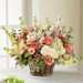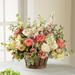 Inspired by French country gardens, this captivating flower bouquet has a Victorian styling your recipient will adore. White and salmon roses made the eyes dance while surrounded by pink larkspur, cream gilly flower, peach spray roses, clouds of white hydrangea, dusty miller stems, and lush greens, arranged to perfection in an oval stained woodchip basket that helps to blend soft sophistication with raw, rustic appeal. That perfect happy birthday, thinking of you, or thank you gift! GOOD bouquet includes 13 stems. Approx. 14"H x 16"W. BETTER bouquet includes 18 stems. Approx. 15"H x 18"W. BEST bouquet includes 24 stems. Approx. 16"H x 20"W.