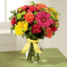 Celebrating life with colorful blooms that inspire and delight, this flower bouquet is ready to create a happy moment for your recipient that they will never forget. Orange roses, hot pink gerbera daisies, yellow gerbera daisies, hot pink carnations, green button poms, bupleurum, and lush greens mingle together to create a sunlit display while seated in a classic clear glass vase tied at the neck with a yellow satin ribbon for a sweet affect. A perfect get well, happy birthday, or congratulations gift! GOOD bouquet includes 12 stems. Approx. 14"H x 11"W. BETTER bouquet includes 16 stems. Approx. 15"H x 12"W. BEST bouquet includes 20 stems. Approx. 16"H x 12"W.