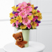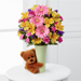 The FTD® Festive Big Hug® Bouquet is a bright and beautiful way to send your warmest wishes and sweet affection. Pink gerbera daisies are surrounded by yellow Peruvian lilies, fuchsia mini carnations, purple statice and lush greens perfectly presented in a ceramic light green vase hugged by a darling brown plush bear to create an incredible gift for any occasion.