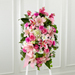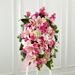 Bright, fresh, beautiful and just right for an elegant expression of heartfelt sorrow and devastating loss. This classic standing arrangement is constructed by a local FTD artisan florist of hand-selected pink blossoms ranging from pale pastels to deep blushing pink. It includes roses, carnations, stock, cushion pompons, Asiatic and Stargazer lilies and hydrangea beautifully set among a field of lush contrasting greens like aspidistra and ivy vines. It comes with a wooden easel for flexible display options and makes an impressive memorable tribute at a wake, funeral or graveside service.