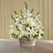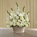 Let this exquisite bouquet deliver your sincere condolences at this time of loss and sadness. An always-appropriate mixed bouquet of white roses, carnations, gladioli, football chrysanthemums, LA hybrid lilies, and million star gypsophelia plus an assortment of lush greens comes hand-arranged in a charming white wood chip basket by a local FTD artisan florist. This versatile arrangement is perfect for display on a table, floor or pedestal at a funeral home, on an altar, floor or sanctuary steps for a funeral, and graveside at a burial ceremony.