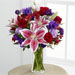 The FTD® Stunning Beauty™ Bouquet is an absolutely lovely way to send your love and affection across the miles. Fragrant Stargazer lilies stretch their star-like petals across a bed of rich red roses, lavender carnations, red Peruvian lilies, purple double lisianthus, purple matsumoto asters and lush greens. Presented in a classic clear glass vase, this elegant bouquet is an incredible way to convey your sweetest sentiments.