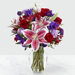 The FTD® Stunning Beauty™ Bouquet blooms with rich, bold blooms, making this a fresh flower bouquet that simply never goes out of style! Fragrant Stargazer Lilies take center stage of this arrangement as they stretch their long star-shaped blooms across a bed of red roses, purple double lisianthus, lavender carnations, red Peruvian Lilies, purple matsumoto asters, and lush greens. Presented in a clear glass vase, this gorgeous bouquet is created just for you to help you celebrate an anniversary, a birthday, or to simply say thank you. GOOD bouquet is approx. 17"H x 14"W. BETTER bouquet is approx. 19"H x 16"W. BEST bouquet is approx. 21"H x 19"W.