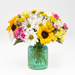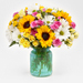 With its sunny hues and fun floral variety, this bouquet will light up the face of whoever you give it to. Through a bright combination of sunflowers, daisy pompons, and spray roses set in a ribbed aqua glass vase, our FTD florists have designed a bouquet that brighten up every moment. GOOD bouquet is approx. 11”H x 11”W. BETTER bouquet is approx. 12”H x 12”W. BEST bouquet is approx. 13”H x 13”W.