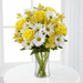 C3-4793The FTD® Sunny Sentiments™ Bouquet is a blooming expression of charming cheer. Brilliant yellow roses and Peruvian Lilies are paired with white traditional daisies and green button poms to create a memorable bouquet. Accented with lush greens and arranged in a classic clear glass vase, this bouquet is a wonderful way to celebrate any of life's special moments