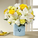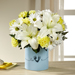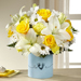 BB1The FTD® Tiny Miracle™ New Baby Boy Bouquet is the perfect way to send your happy wishes to the new family! Blooming with warmth and sunlight, this gorgeous flower bouquet brings together yellow roses, yellow carnations, yellow mini carnations, white Asiatic Lilies, and white traditional daisies to create a memorable gift. Presented in a keepsake blue ceramic vase with "Love" written in a script font on the front, and the print of a baby's foot making up the 'V' in the word for a sweet and touching affect, this fresh flower arrangement is a wonderful way to send your congratulations to friends and family at this joyful time in their lives. GOOD bouquet includes 10 stems. Approx. 11"H x 10"W. BETTER bouquet includes 14 stems. Approx. 12"H x 10"W. BEST bouquet includes 18 stems. Approx. 13"H x 11"W.