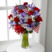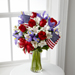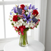 The FTD® Unity™ Bouquet sparks the hearts of all Americans with its patriotic beauty and dazzling color. Bright red roses mingle with blue iris arranged amongst white Peruvian lilies and assorted greens. Accented with two American Flags and a red, white and blue ribbon, this stunning bouquet arrives arranged in a clear glass vase to create a gorgeous way to celebrate our Independence Day.
