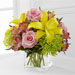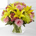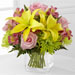 The FTD® "Well Done"™ Bouquet brings together bright roses and sunny Asiatic lilies to congratulate your special recipient on a job well done! Pink roses, green Fuji chrysanthemums, pink Peruvian lilies, yellow Asiatic lilies and lush greens create a colorful, celebratory flower bouquet arranged within a clear glass cubed vase to add to the festivities of their happy day.
