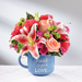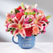 FT2Bright, beautiful and ready to send your warmest wishes of faith and love to your recipient, The FTD® Be Blessed™ Bouquet is the perfect gift! A warm and sunlit arrangement of coral roses, hot pink carnations, hot pink mini carnations, Stargazer Lilies, green button poms and lush greens are presented in a reusable keepsake blue ceramic oversized mug with the sentiment, "Faith, hope & love..." on the front in an attractive white script font. A wonderful thinking of you, thank you, or happy birthday gift!