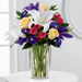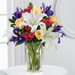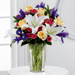 FTD® proudly presents the Vera Wang New Day Dawns™ Bouquet. A colorful burst of roses and iris form a charming bouquet of spring sophistication and timeless elegance. Pale yellow roses, deep purple iris, fuchsia spray roses and white Oriental lilies are brought together to create stunning flower bouquet set to capture their every attention. Presented in a modern clear glass vase, this flower arrangement is a beautiful way to celebrate Easter, extend your birthday wishes, or offer your congratulations throughout the spring months.